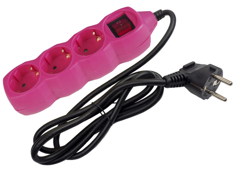 Hálózati hosszabbító elosztó 3 aljzat 16A földelt kapcsolós 1, 5m RÓZSASZÍN