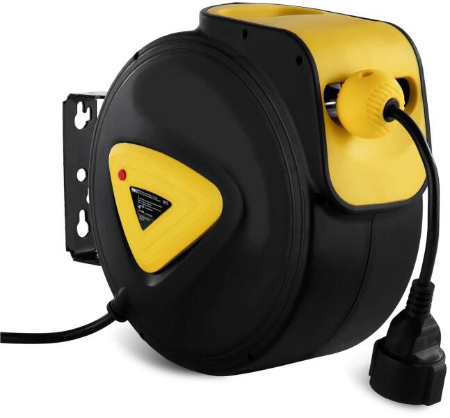Ha nincs a közelben konnektor, akkor kénytelen a kábelt a műhelyen vagy a dolgozó szobán keresztül húzni, így a kábelek egymásba csavarodnak. Erre szerencsére létezik egy praktikus megoldás: az automatikus kábelfeltekerő, amely a mennyezetre vagy a falra rögzíthető. Használja ki a teret, és gondoskodjon arról, hogy mindig legyen egy elérhető kábel a közelben. A kábel dob egy a konnektorhoz való kábellel és egy a készülékhez való, 20 méteres kábellel van felszerelve. Az utóbbi bármikor kihúzható a dobból. Az automatikus kábeldob a mennyezetre vagy a falra erősíthető egy rögzítő segítségével, attól függően milyen a helyiség kialakítása. Így Ön olyan rugalmas áramforrást használhat, amely nem feltétlenül a padlón helyezkedik el. A kábel kényelmesen, az Ön igényeinek megfelelően kihúzható a dobból. A kábelen egy méterenként 2-3 három rögzítési pont található. Ennek segítségével beállíthatja a kábel hosszát. Mivel a kábeldoboz a mennyezetre vagy a falra szerelhető, a kábelt akár egy másik helyiségből is használhatja, ehhez mindössze a kábel hosszának megfelelő beállítására van szükség. A hosszabbító kábelek kézzel való feltekeréséhez gyakorlatra van szükség, és még a mechanikus kábeldobok is gyakran összecsavarják a kábeleket. Ezzel az eszközzel a kábel feltekerése azonban nagyon egyszerű. A rúgós behúzási mechanizmus segítségével a kábel egy szempillantás alatt eltűnik. A automatikus kábelfeltekerő a rendért és biztonságért felel dolgozó szobájában, illetve mindig rugalmasan elérhető áramforrást biztosít és a kábelek összecsavarodását is megakadályozza. Ha Önnek csak alkalmanként van szüksége áramellátásra, a kábel a következő használatig védve van a kábeldobozban. Az automatikus kábeldoboz professzionális műhelyekben nem használható.