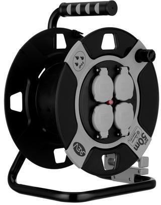 IP44-es védettségű, kültéri használatra alkalmas üres kábeldob 4 darab csapófedeles aljzattal. A maximum 50 méteres kábelt befogadó kialakítás ütésálló polipropilén házzal párosul, a fedél pedig védelmet nyújt a nedvesség és szennyeződések ellen. Több készülék egyszerre történő biztonságos üzemeltetésére alkalmas, feltekert állapotban max. 1000 W, letekert kábellel pedig 3000 W teljesítményig.